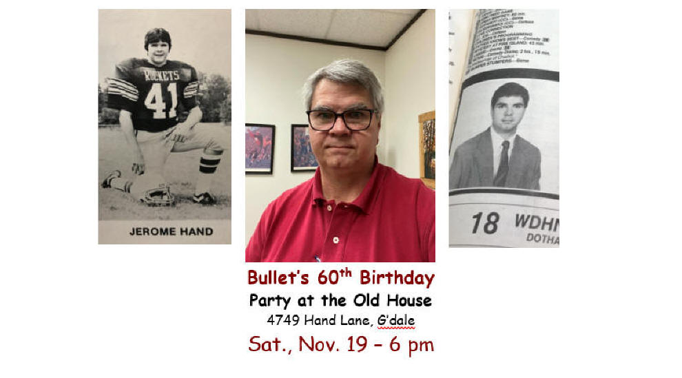 Special Invitation to all BDFL members, family, fans, friends and other athletic supporters... You are invited to Bullet's 60th Birthday Party. It is scheduled for Saturday, November 19th at 6pm at the Old House on Hand Lane (4749 Hand Lane) just off Fieldstown Road in Gardendale, 35071. All BDFL owners, general managers, coaches, players, family members, and groupies will be able to get autographs and selfies with Bullet. Reminder, there will be no disparaging comments and no BS allowed at this event. |